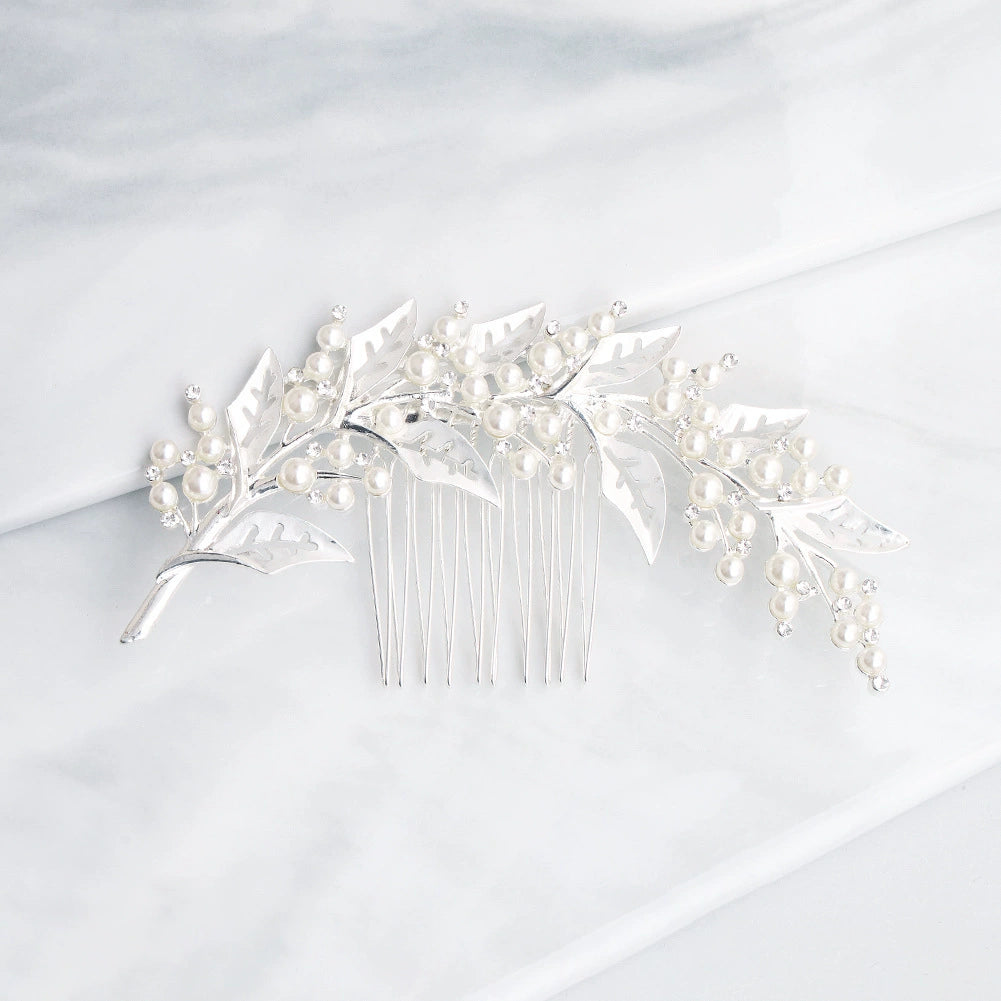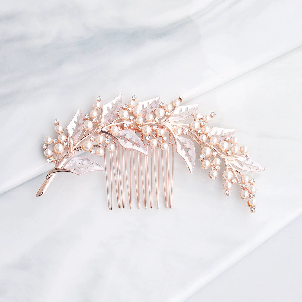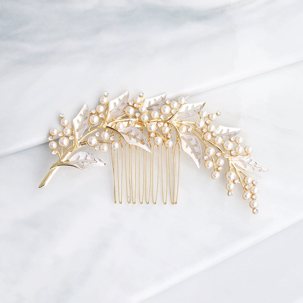 Alloy Leaf Pearl Rhinestone Diamond Hair Comb For Bride Wedding Headwear Retro Style