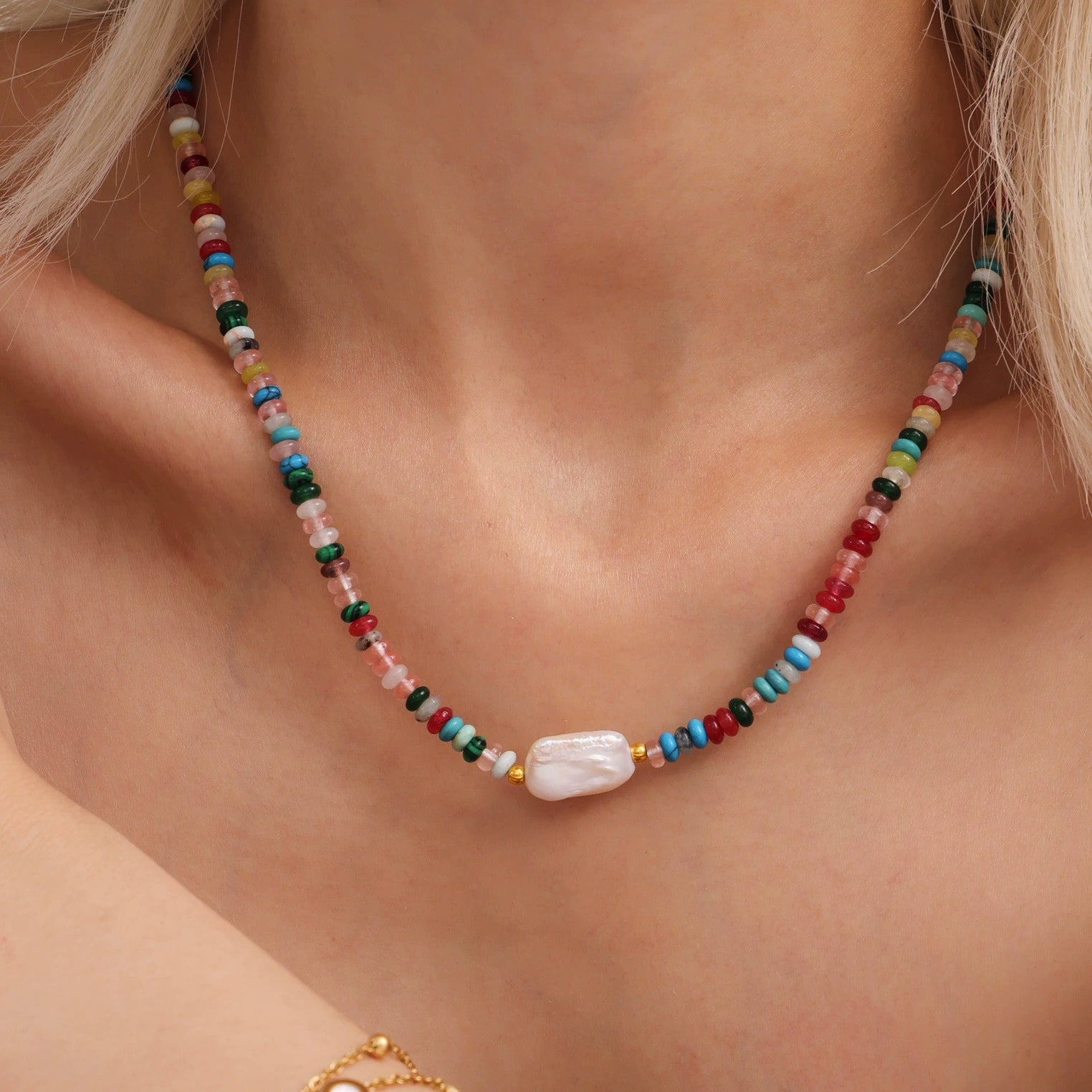 Wholesale Unisex Ferris Wheel Colorful Natural Stone Beaded Necklace With Freshwater Rice Pearl Simple Geometric Titanium Steel Electroplated Clavicle Chain