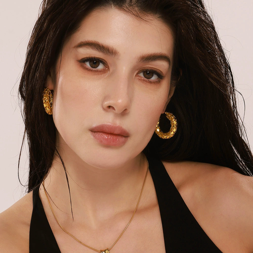 Wholesale Women's Fashion Geometric Round Fish Scale Hollow Stitching Titanium Steel Electroplated 18K Gold Earrings