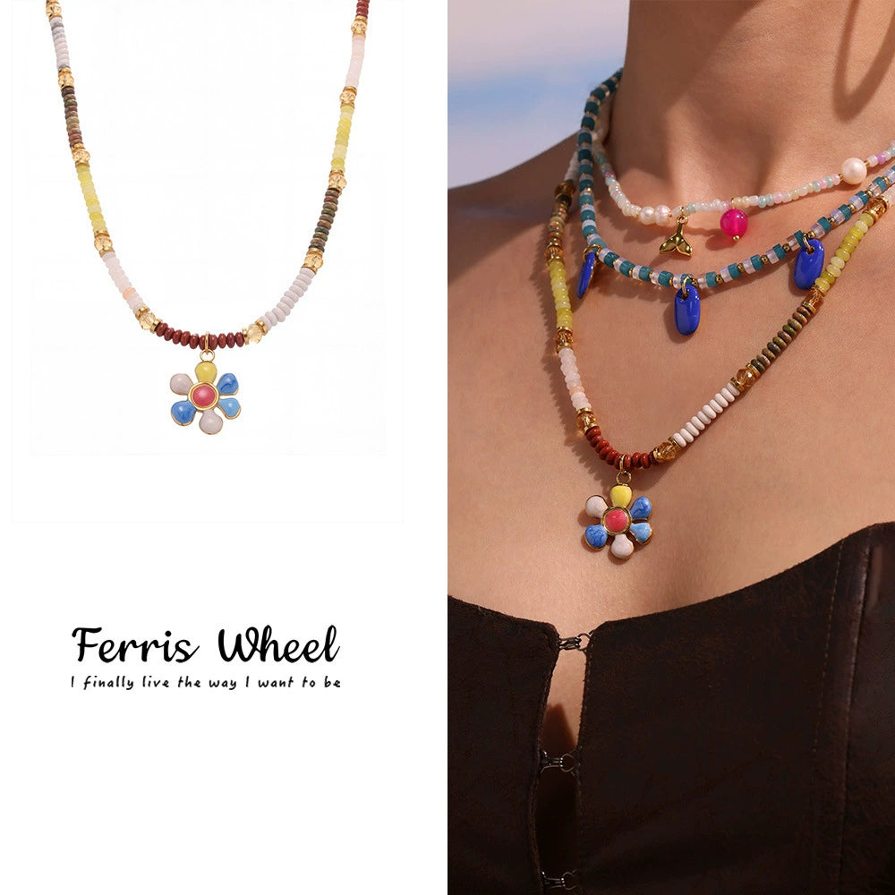Wholesale Women's Retro Minimalist Geometric Ferris Wheel Necklace With Freshwater Pearl Agate And Stainless Steel Electroplated Pendant