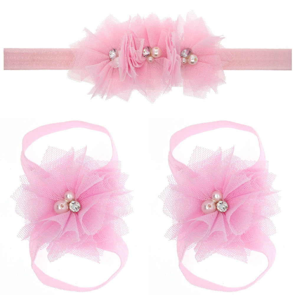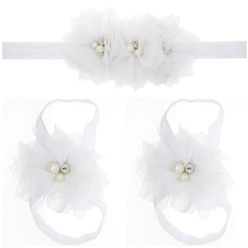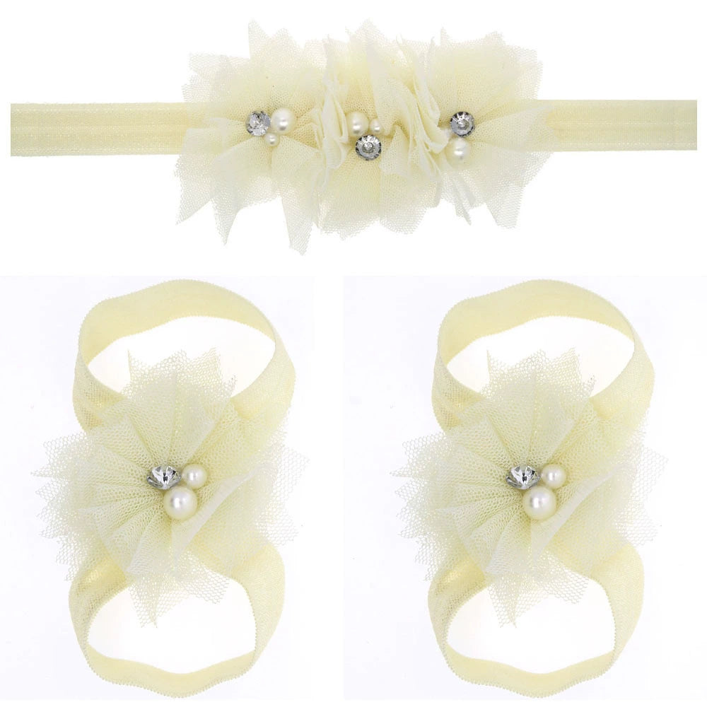 Baby Cloth Lace Pearl Rhinestone Flower Handmade Threepiece Set With Headband And Foot Band