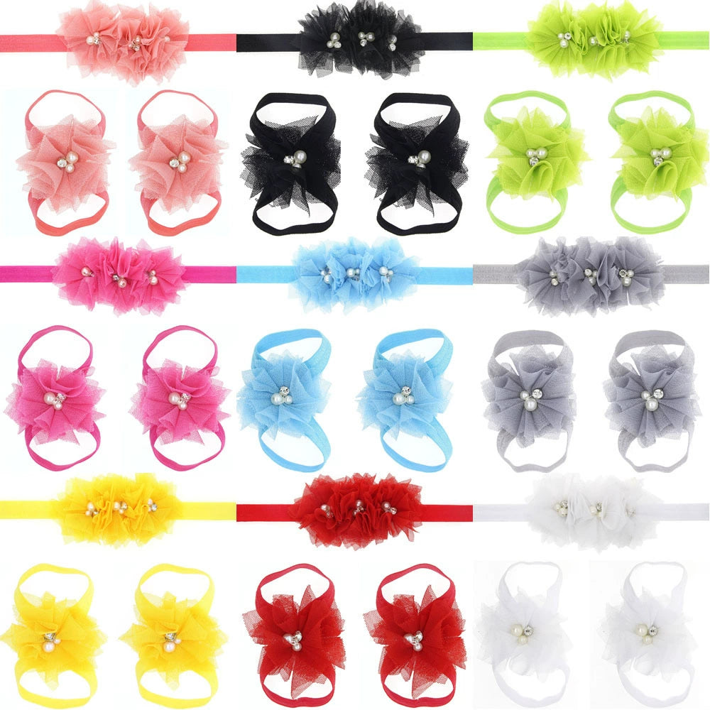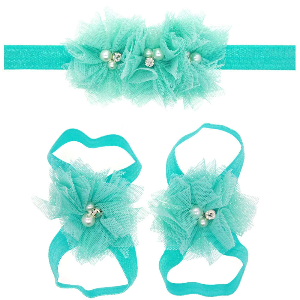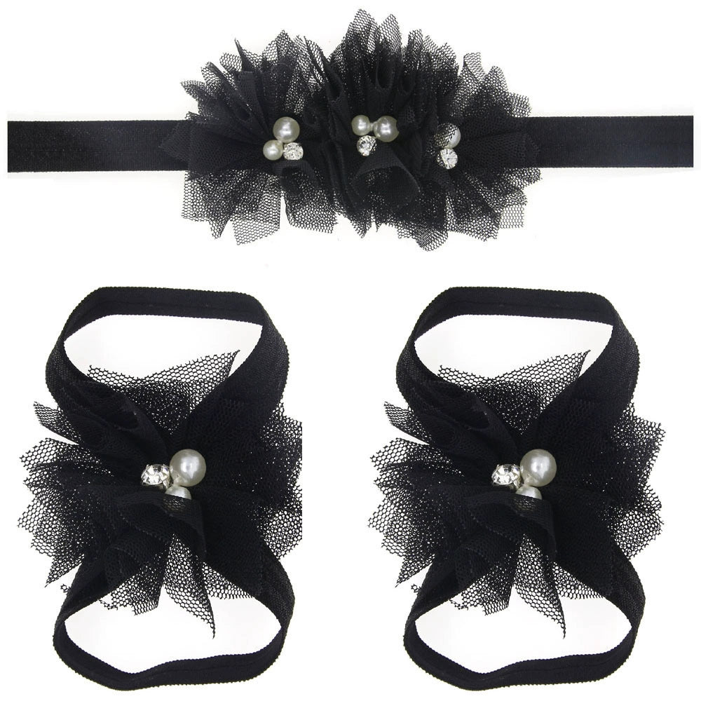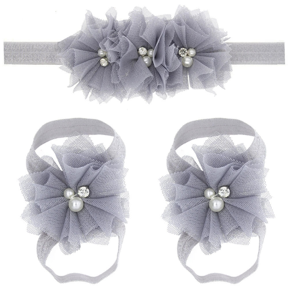 Baby Cloth Lace Pearl Rhinestone Flower Handmade Threepiece Set With Headband And Foot Band