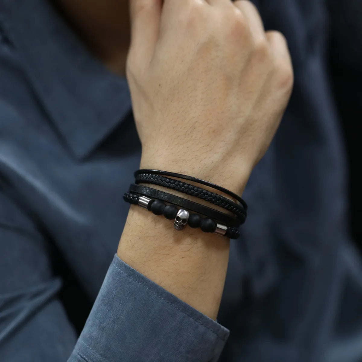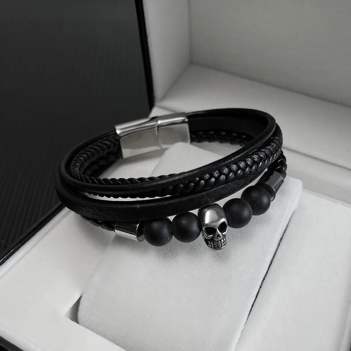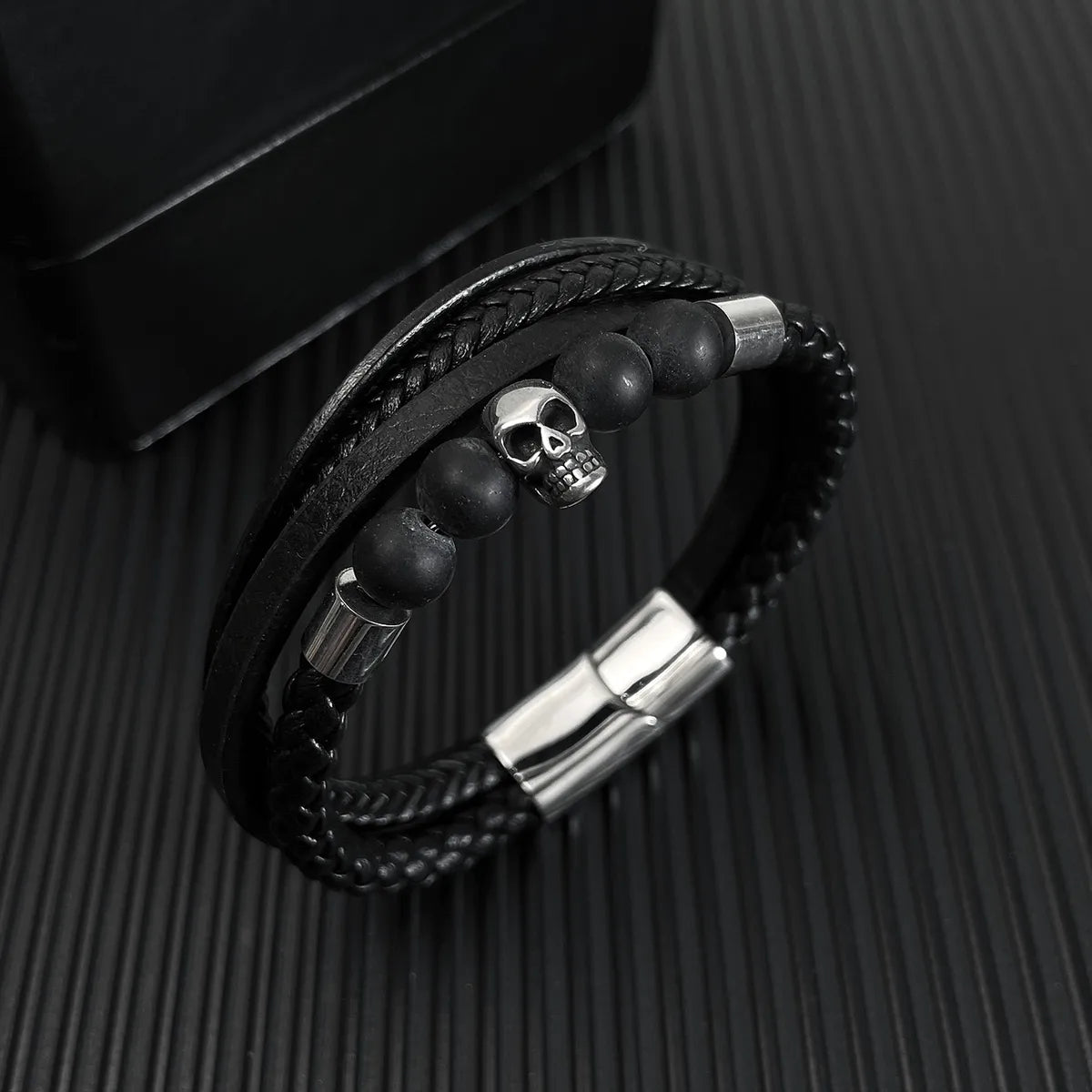 Hip-Hop Vintage Style Skull Stainless Steel Pu Leather Braid Men'S Bracelets