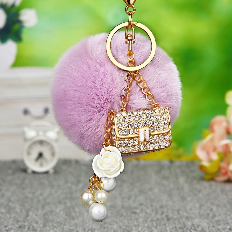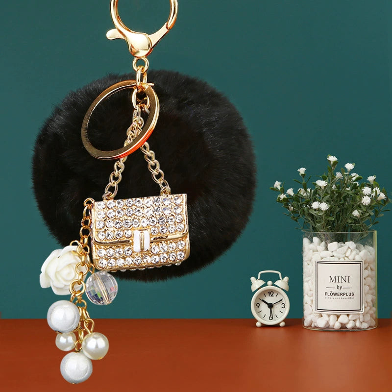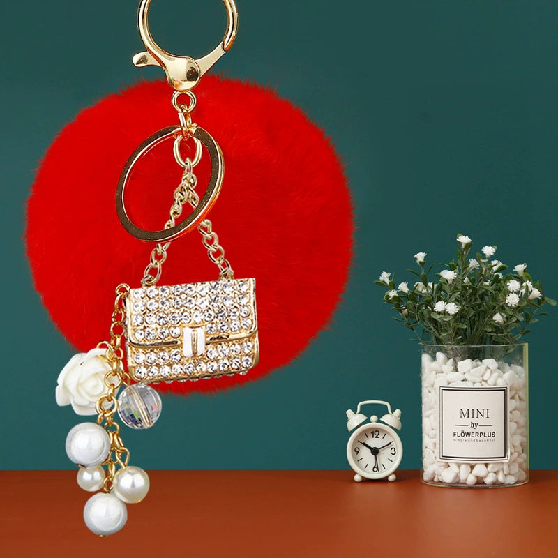 Plush Satchel Style Women's Car Keychain Diamond Encrusted Creative Bag Pendant Fur Ball Gift