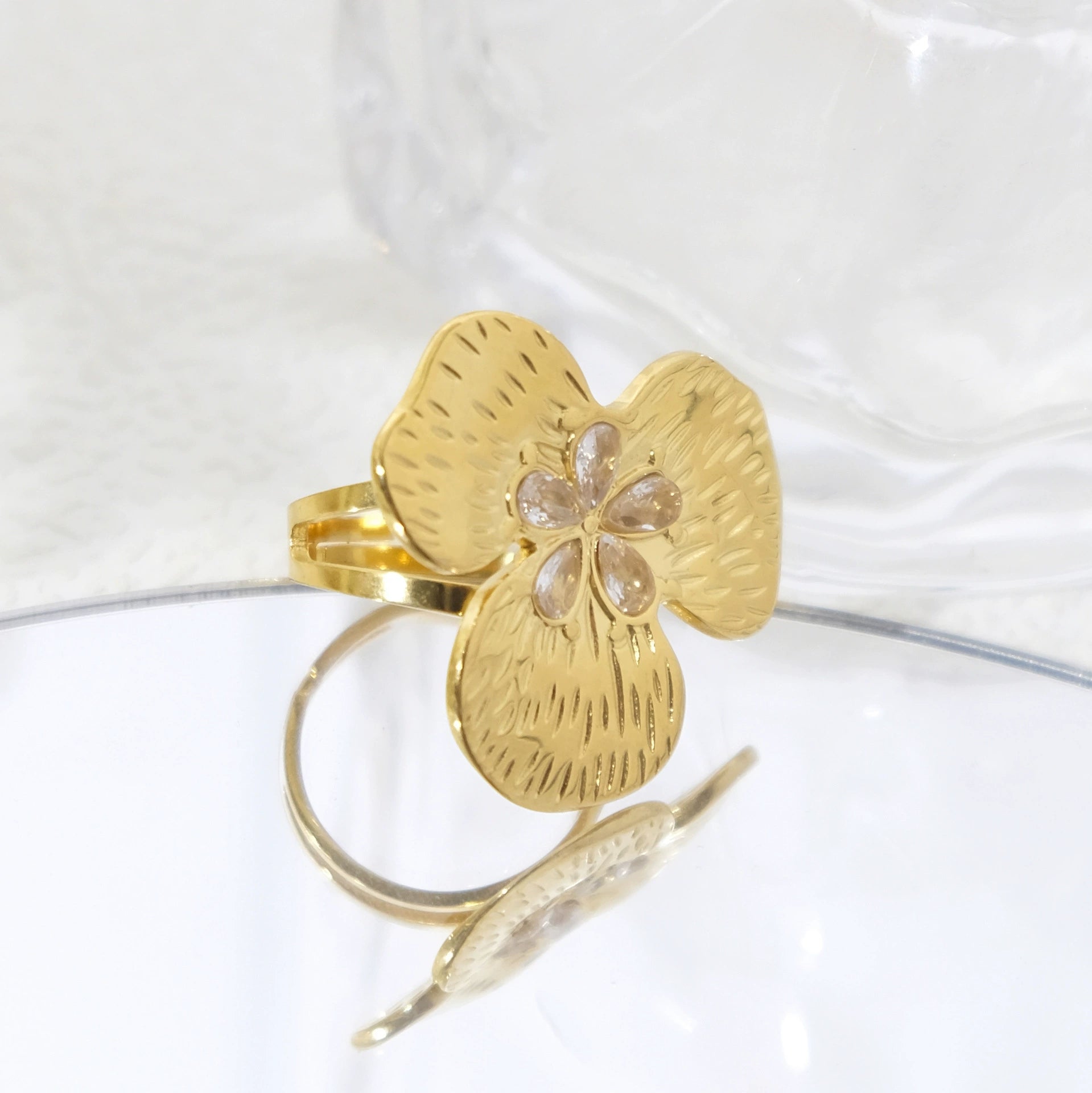 Wholesale Stainless Steel Threepetal Flower Shining Zircon Inlaid Electroplated Unisex Ring