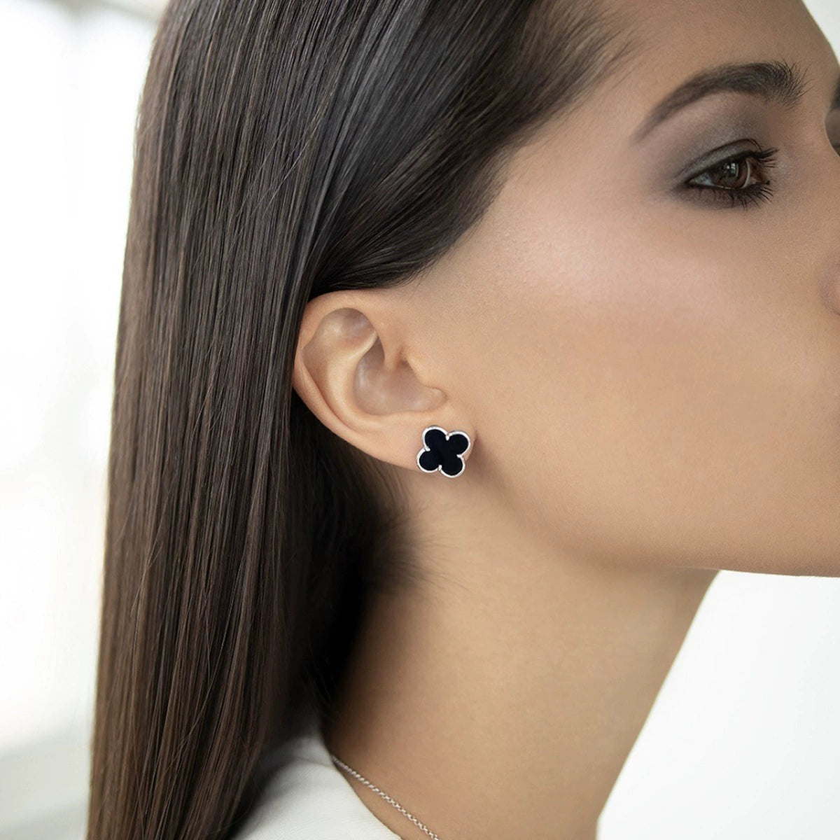 925 Sterling Silver Black Agate Fourleaf Clover Bracelet Earrings Necklace Set Seiko Plants Flowers Pattern Women's