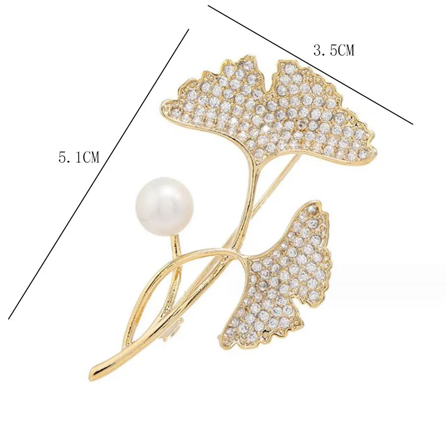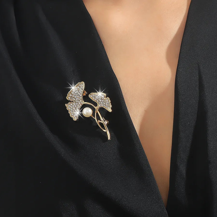 Casual Shiny Ginkgo Leaf Alloy Inlay Artificial Rhinestones Pearl Women'S Brooches