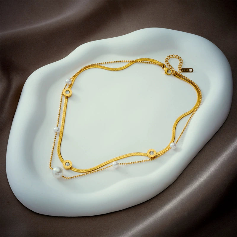 Doublelayered Pearl Roman Numeral Round Plate With Diamond Accessories Titanium Steel Elegant Retro Clavicle Necklace Electroplated