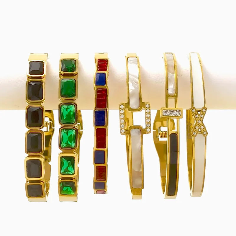 Elegant Simple Style Shiny Geometric Titanium Steel Gold Plated Artificial Gemstones Shell Bangle In Bulk