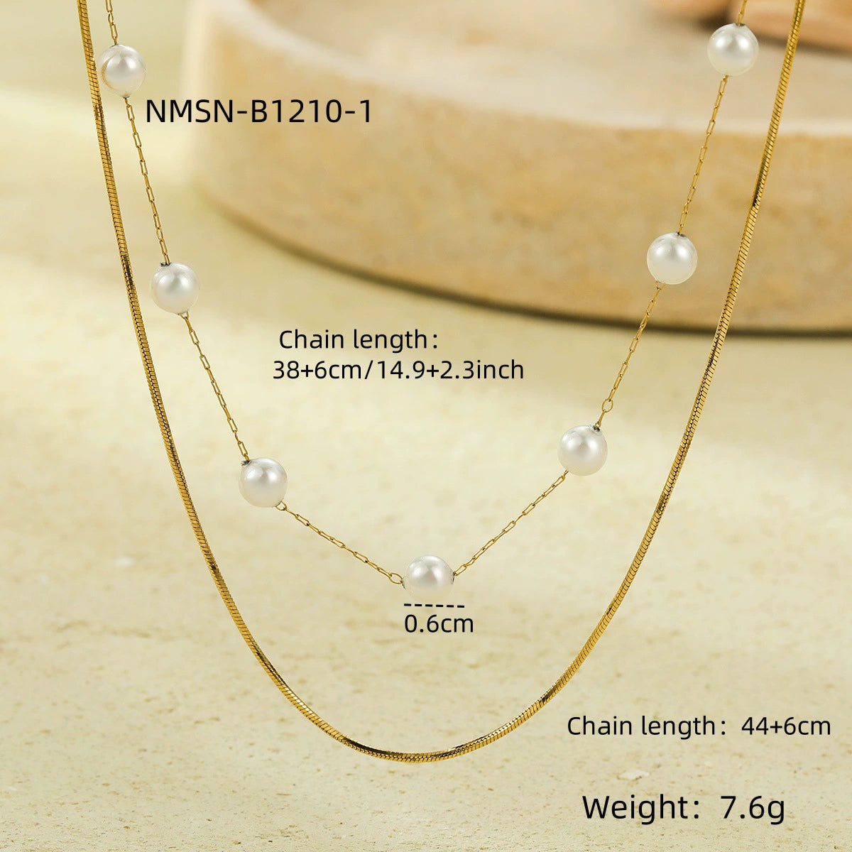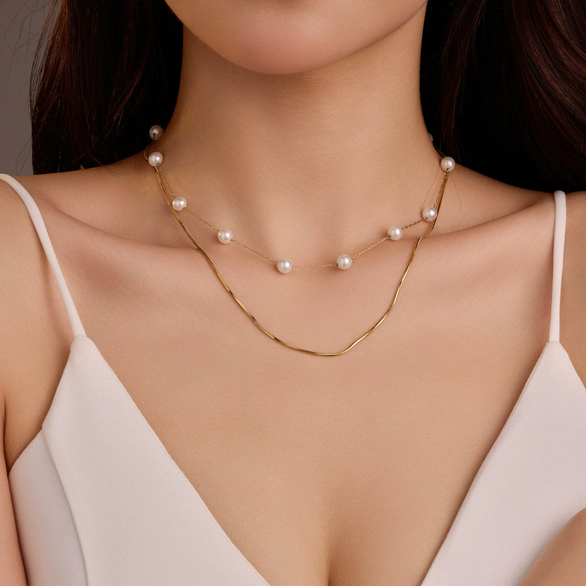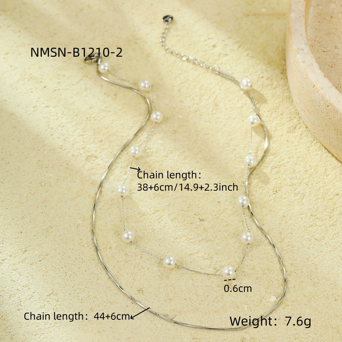 Fashion Joker Pearl Stainless Steel Snake Chain Double Clavicle Chain Stacked Necklace For Women Electroplated