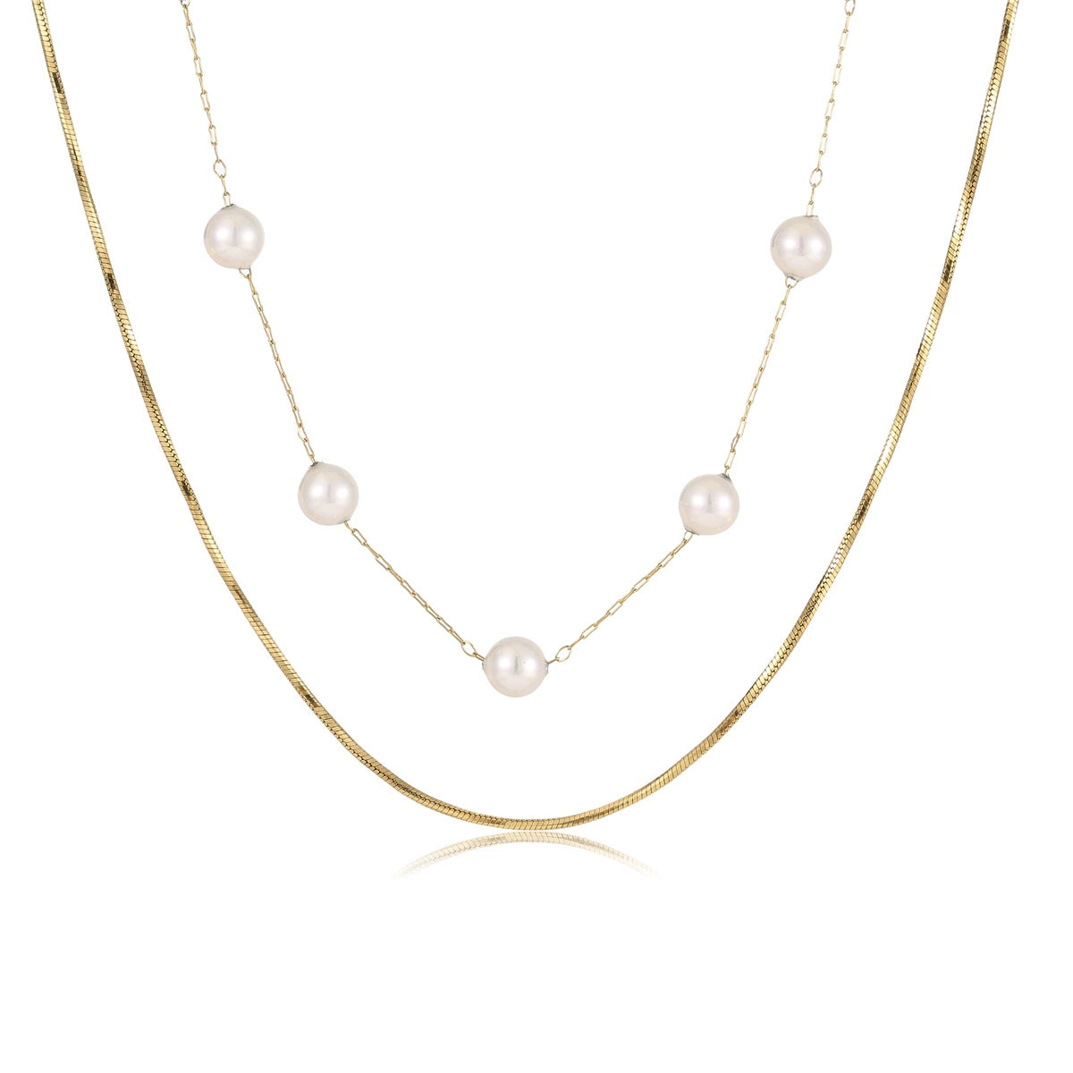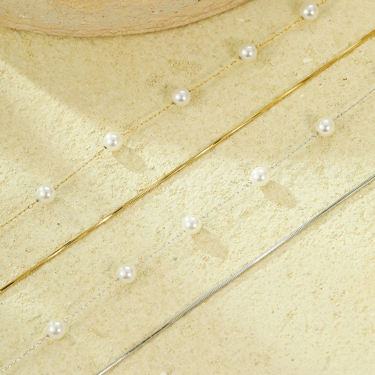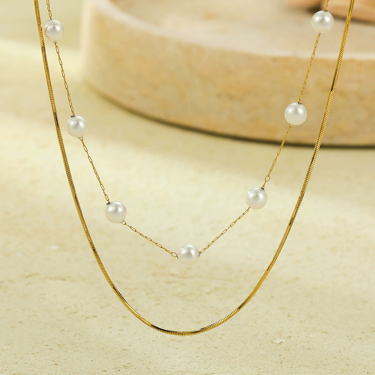 Fashion Joker Pearl Stainless Steel Snake Chain Double Clavicle Chain Stacked Necklace For Women Electroplated