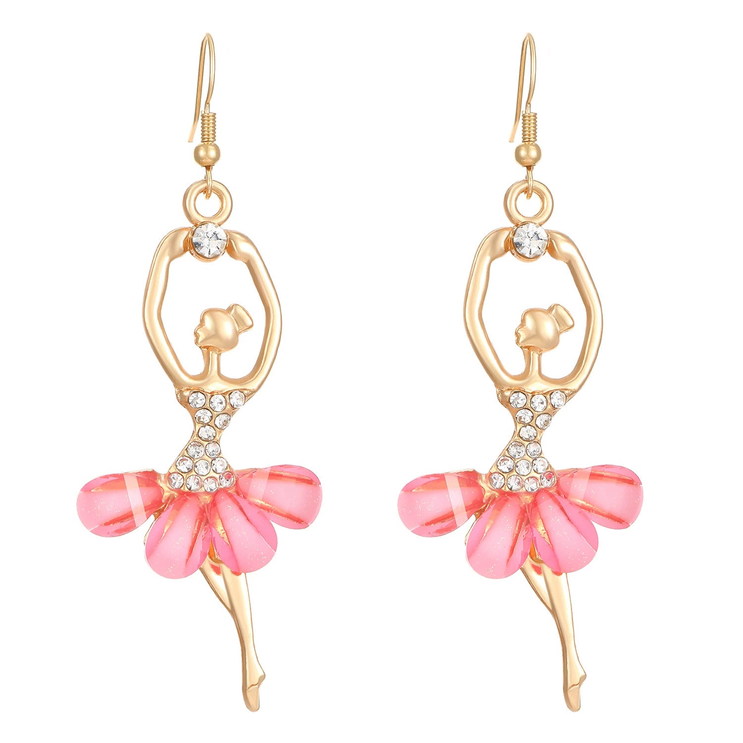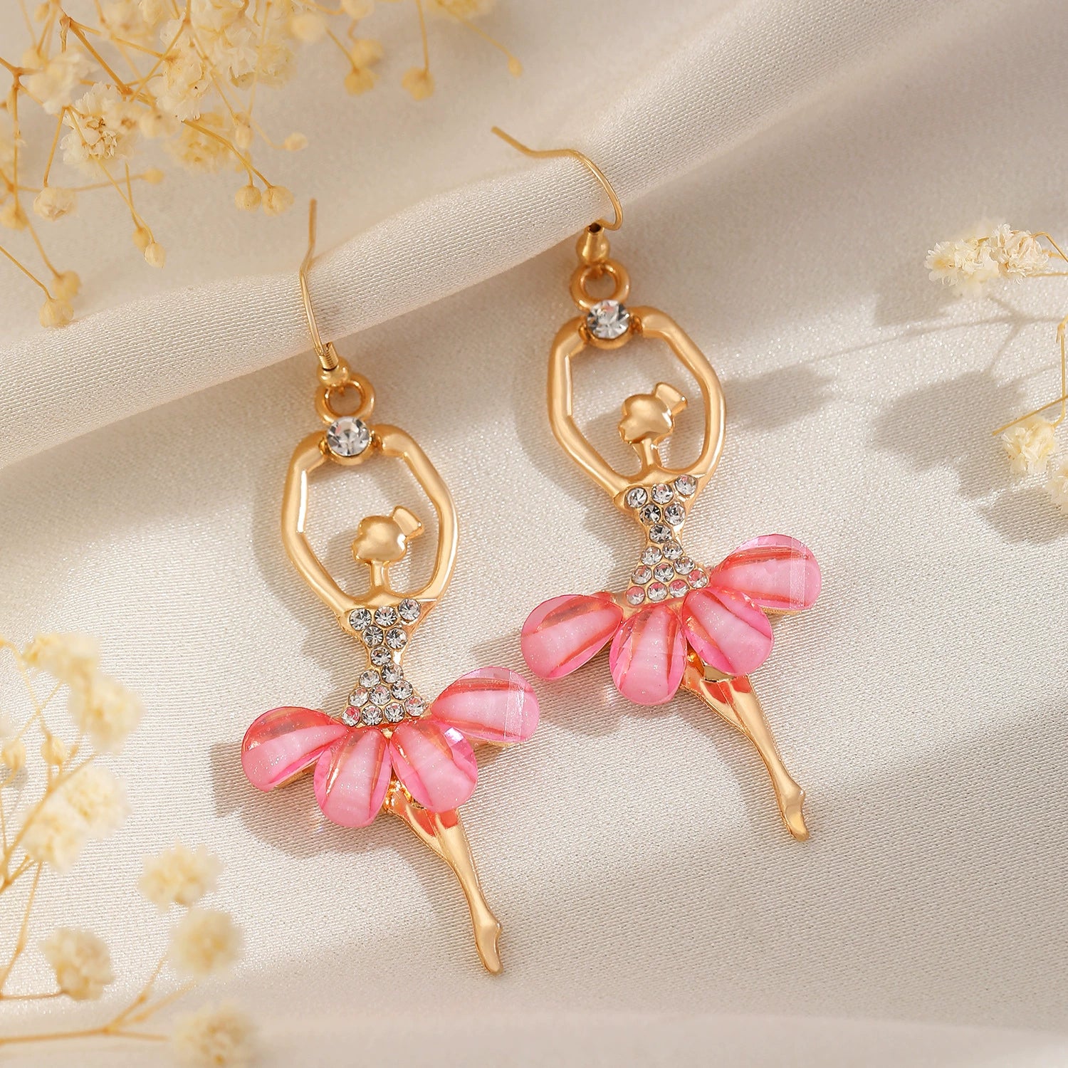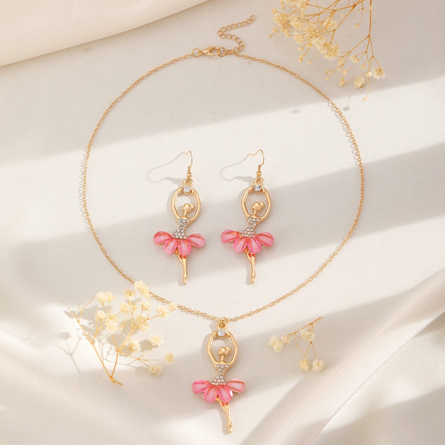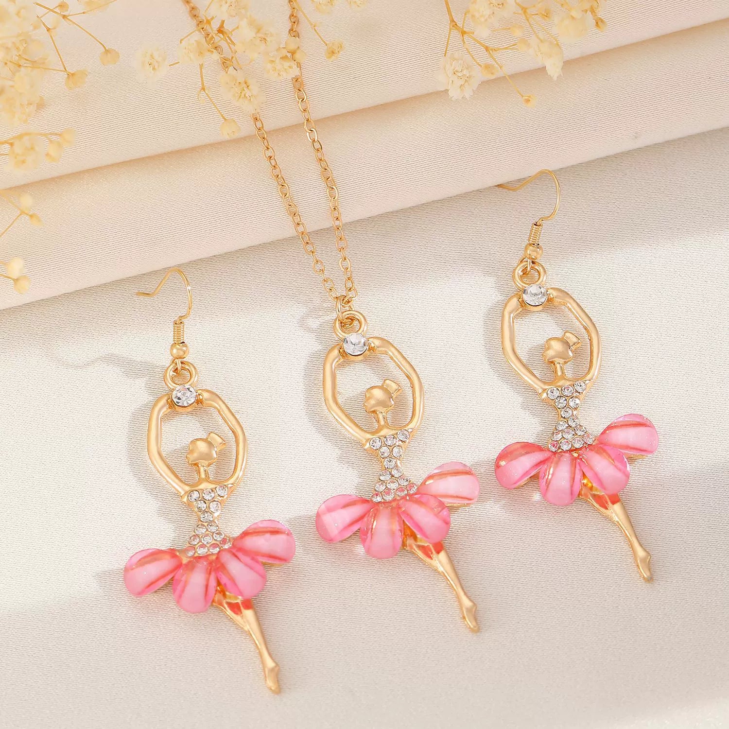 Pink Skirt Ballet Girl Alloy Fashion Jewelry Set With Electroplated Clavicle Chain And Diamond Crystal Earrings For Women