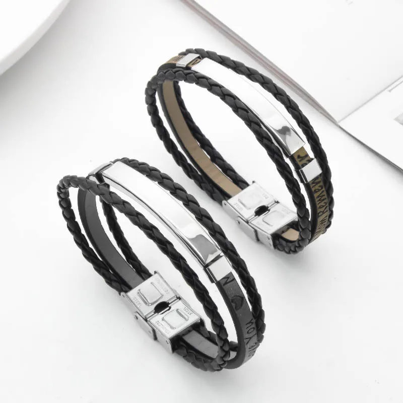 Retro Classic Style Customization Laser Engraving Pu Leather Titanium Steel Polishing Men'S Bracelets Men Cord & Leather Bracelets