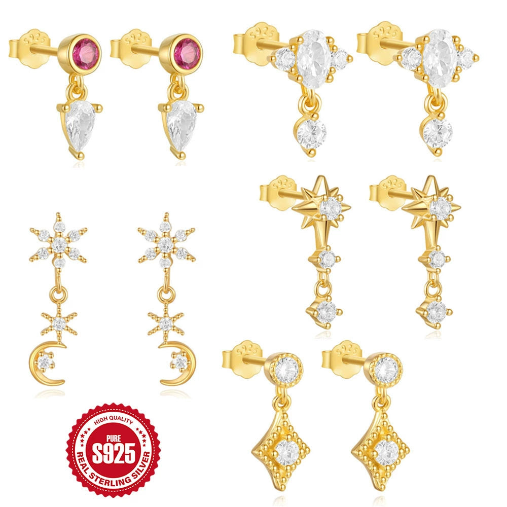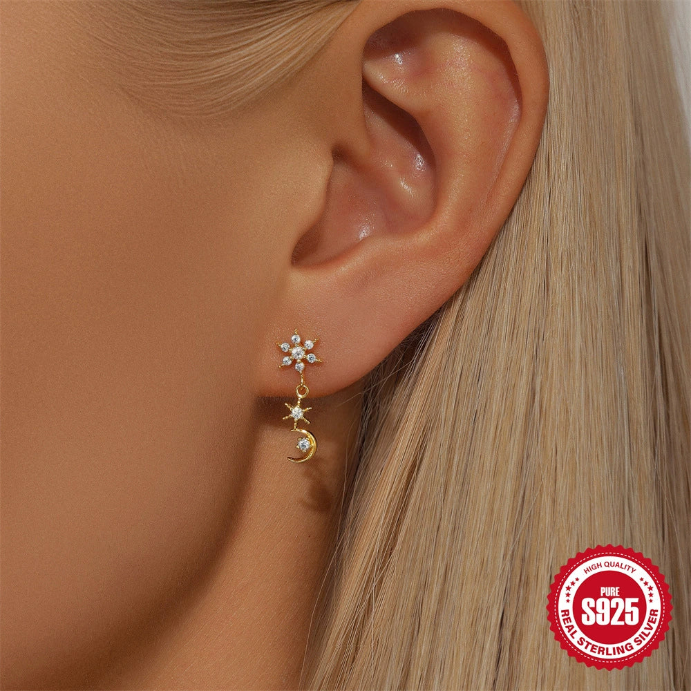 S925 Sterling Silver Octagonal Star Moon Geometric Women's Earrings With Electroplating