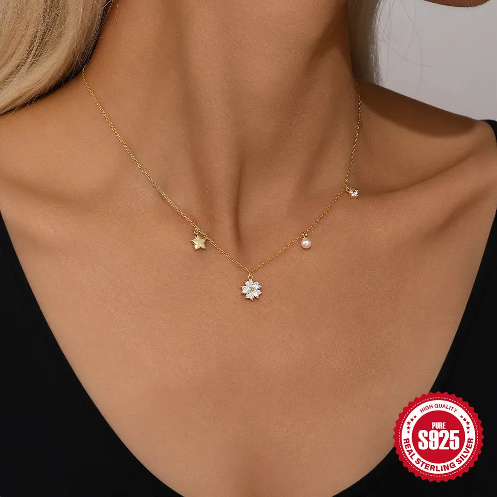 Sterling Silver Pearl Zircon Cable Chain Inlay Geometric Pendant Necklace
