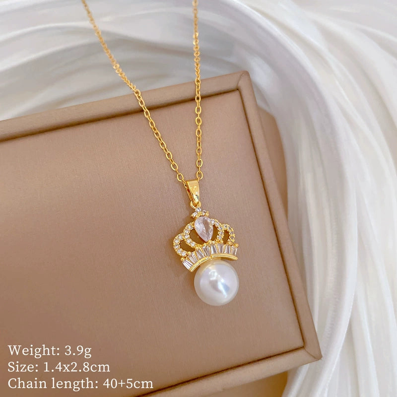 Titanium Steel Women's Geometric Light Luxury Full Diamond Pearl Crown Style Necklace Earrings Set With Electroplating