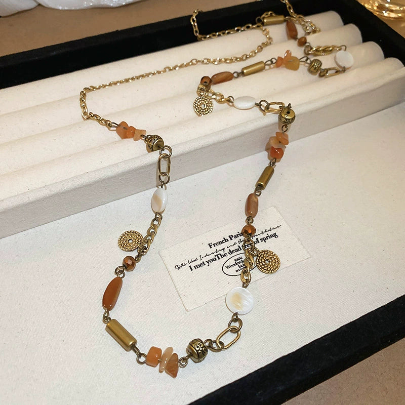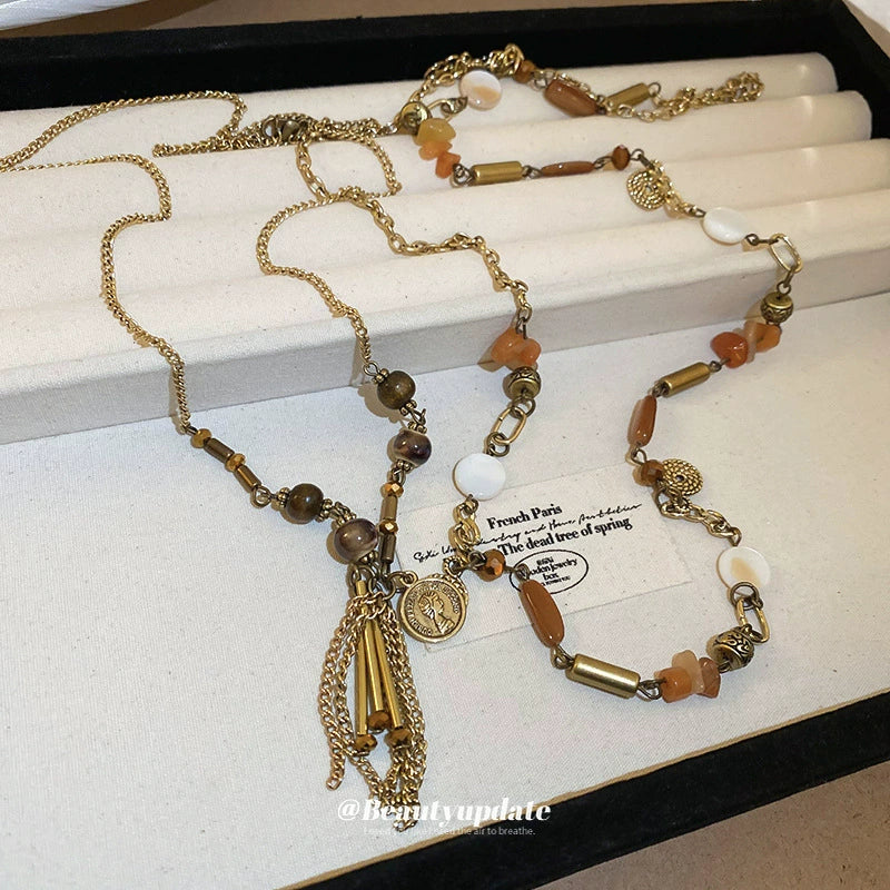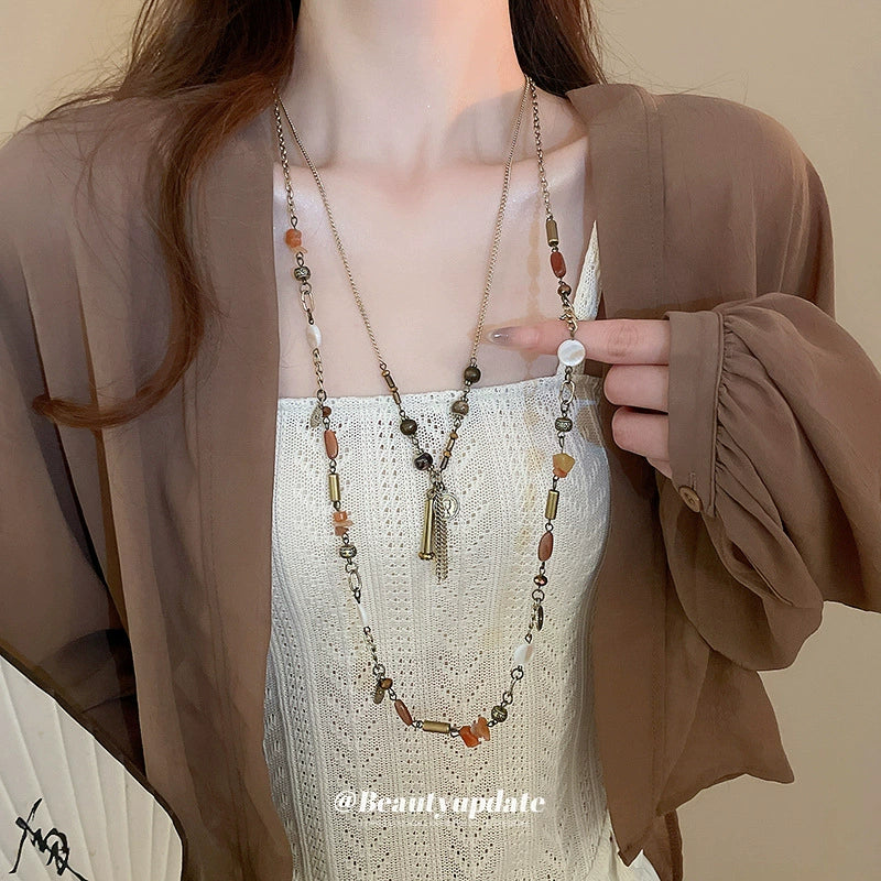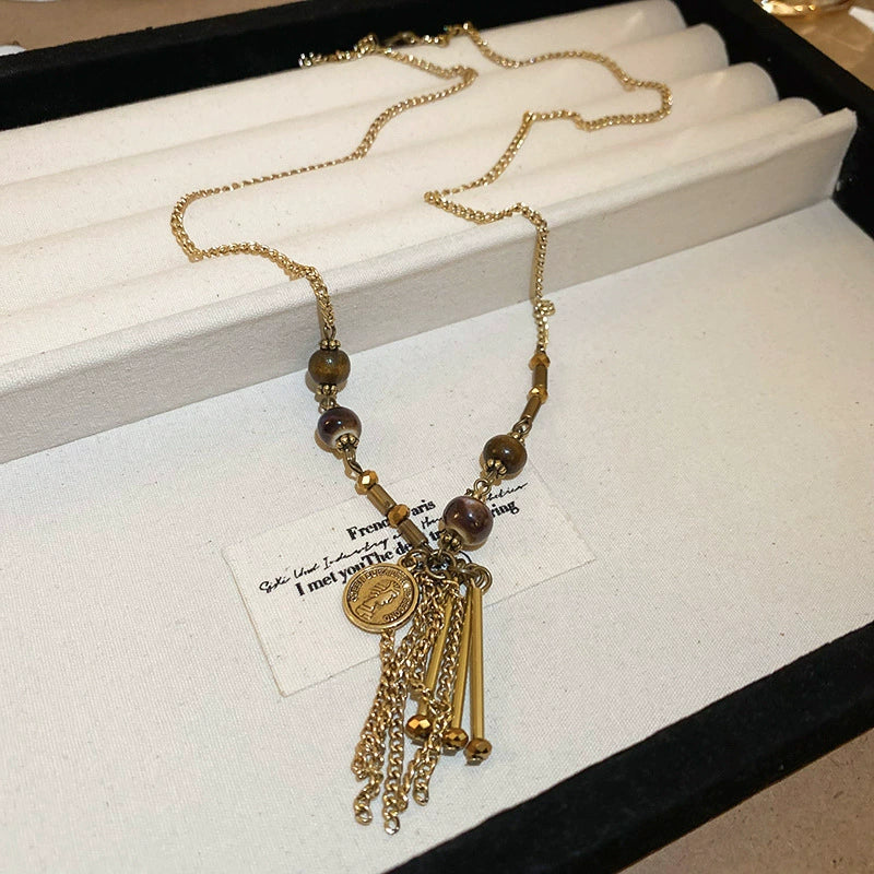 Vintage Women's Coin Tassel Beaded Necklace With Artificial Crystal And Geometric Pattern Long Woolen Chain Set With Crystal