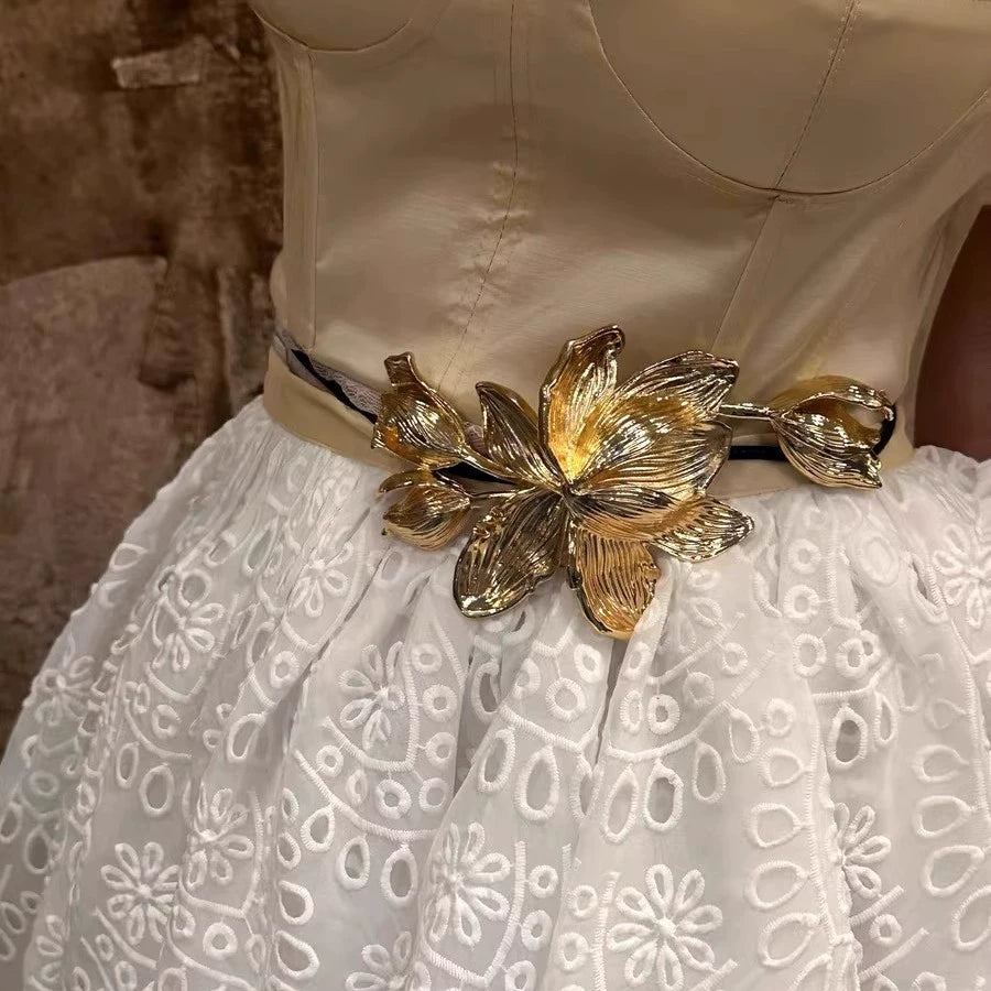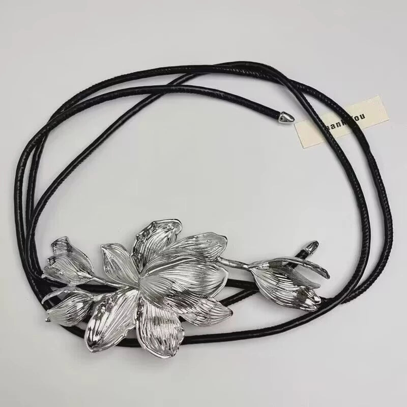 Waist Chain Retro Elegant Tulip Large Flower Style Black Leather Rope Metal Decorative For Female
