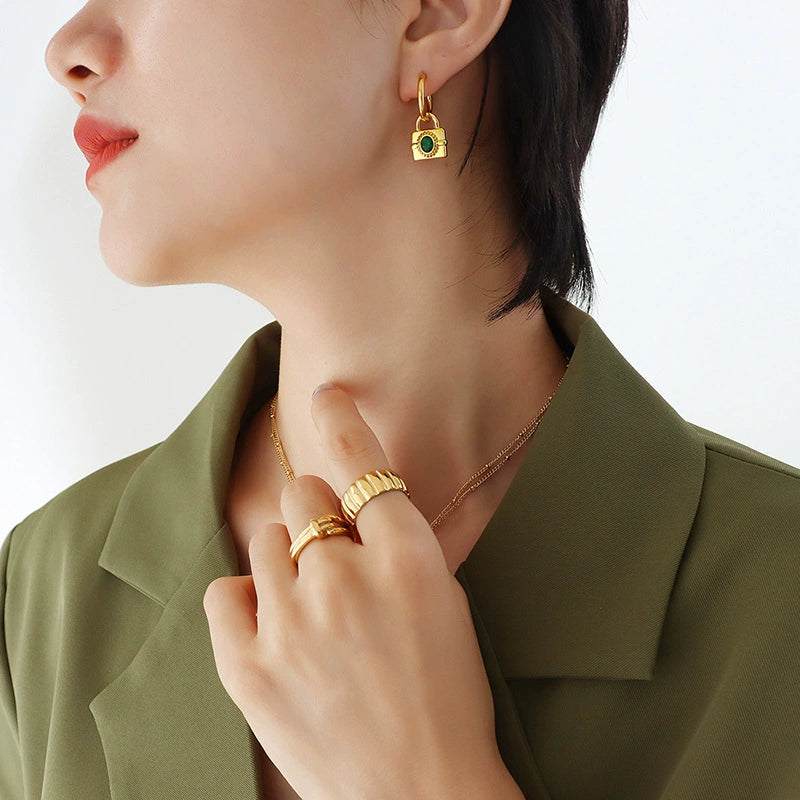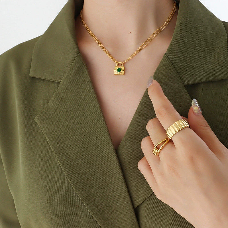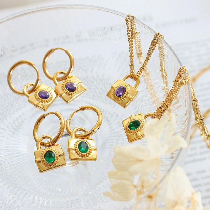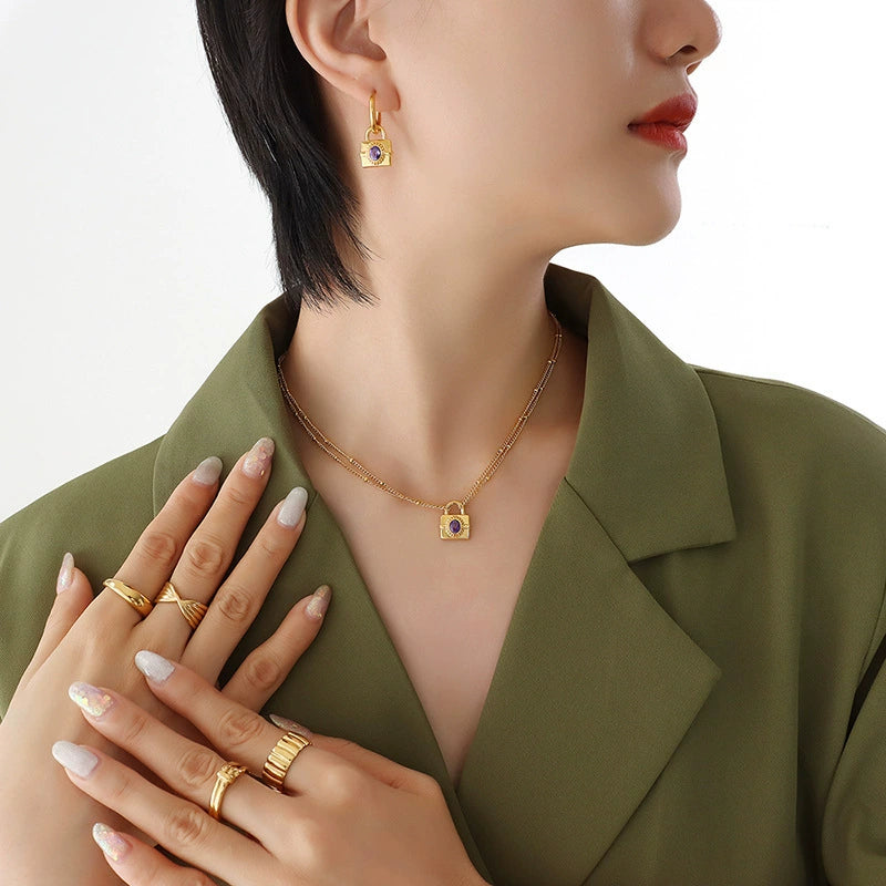 Wholesale Exaggerated Heavy Chain Zircon Lock Hip Hop Necklace Bracelet Set For Women Titanium Steel Electroplated
