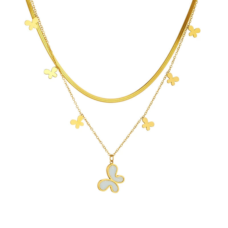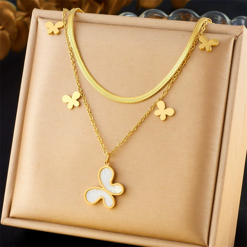 Wholesale Fashion Heart Shape Butterfly Blade Double Pendant Necklace In Stainless Steel And Titanium Steel With Electroplating