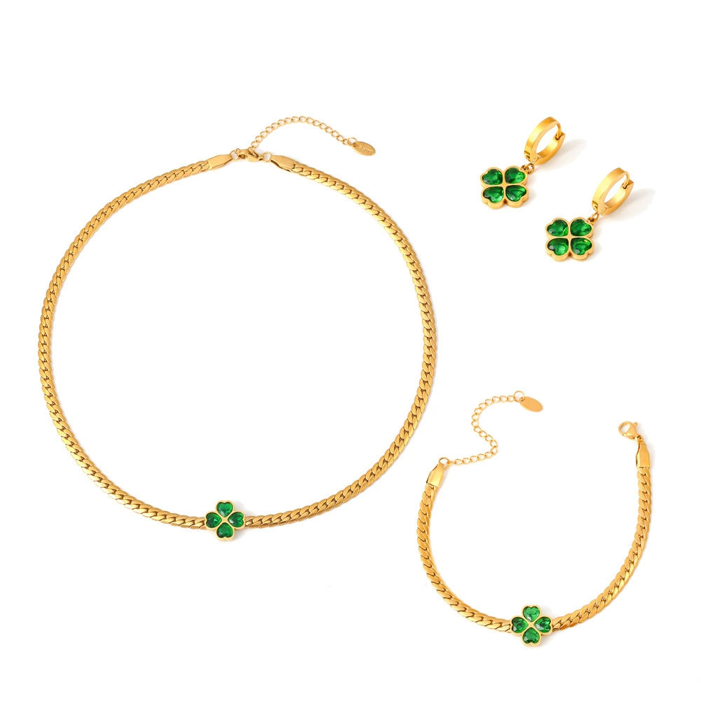 Wholesale Jewelry Four Leaf Clover Glass Stone Stainless Steel Earrings Necklace Bracelet Three Piece Set With Electroplating