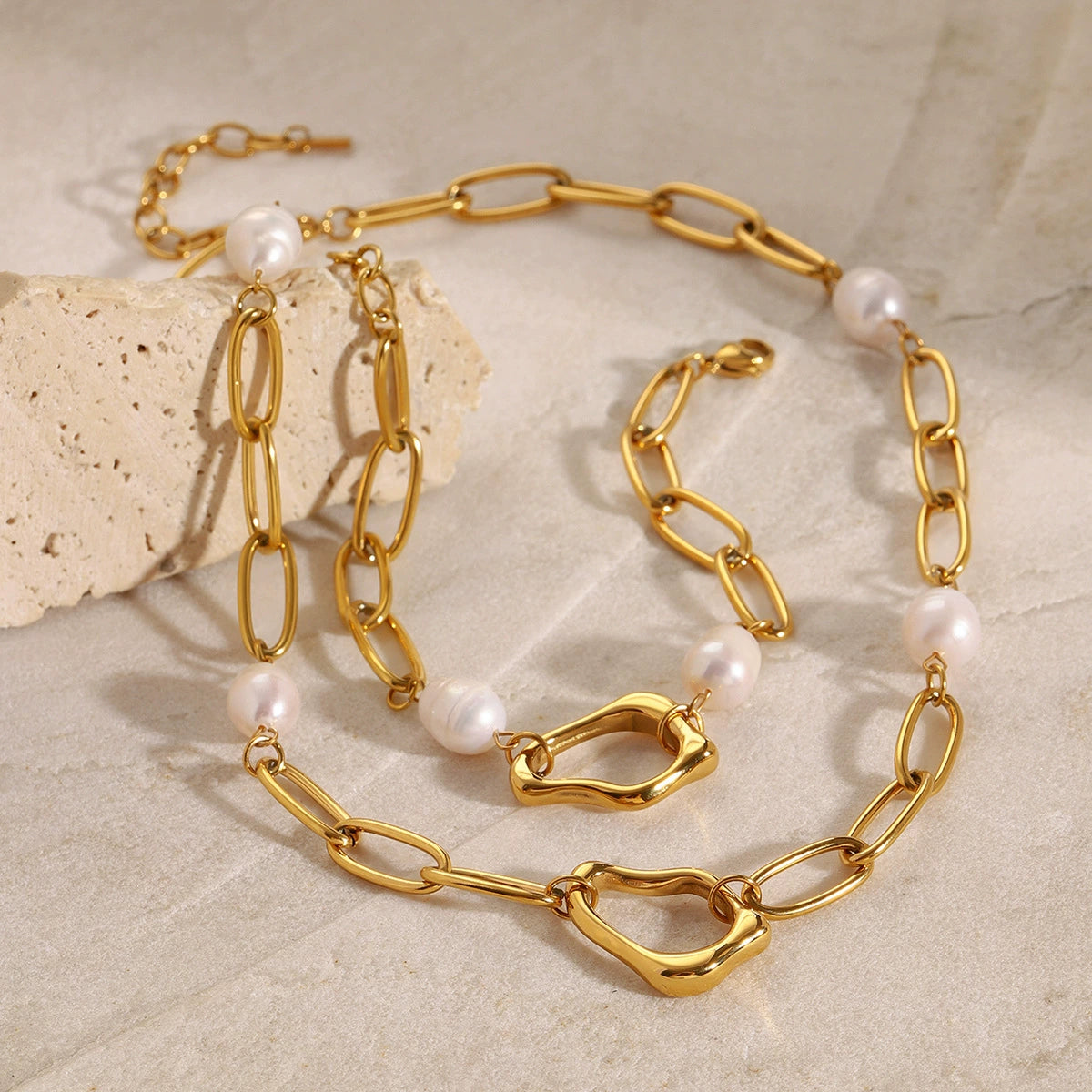 Wholesale Stainless Steel And Pearl Irregular Pendant Necklace With Wave Pattern Electroplated French Retro Style