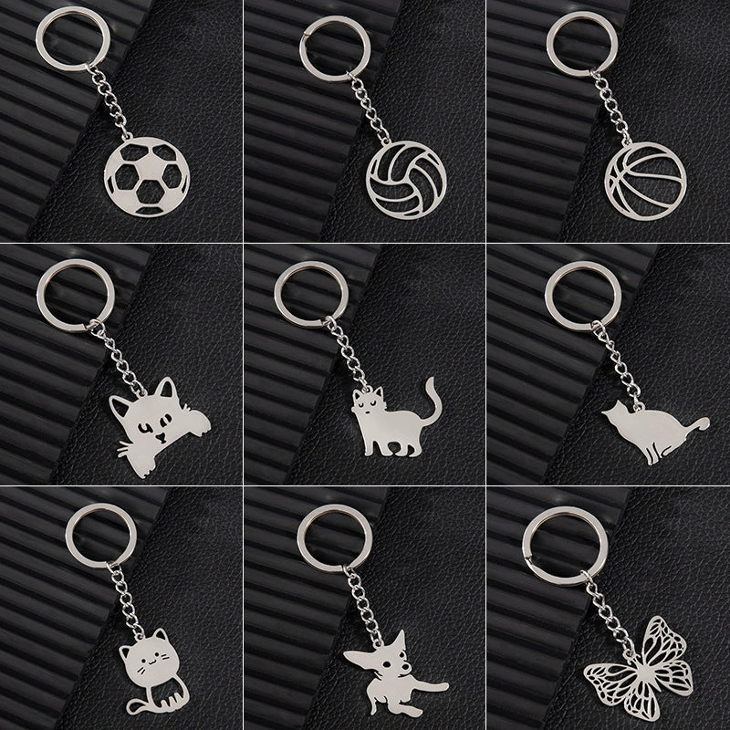 Wholesale Stainless Steel Keychain With Geometric Round Volleyball Football And Animal Bear Little Pig Pendants Electroplated