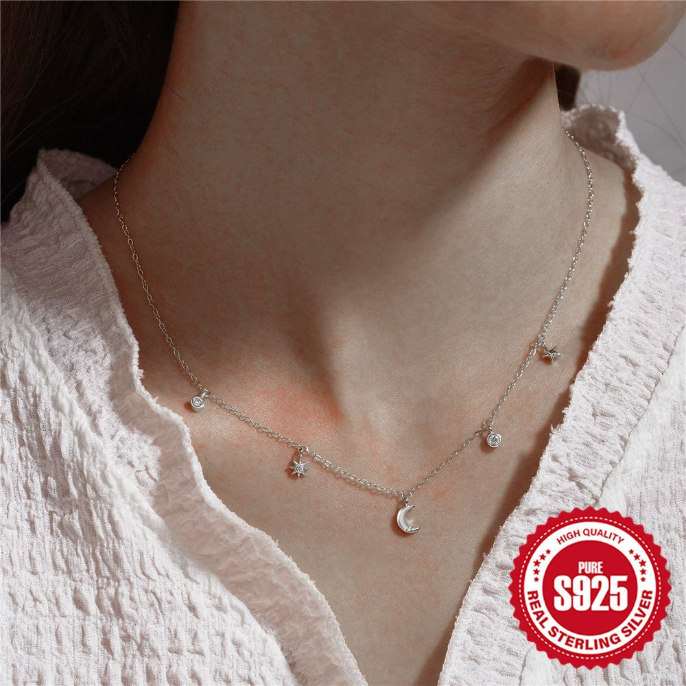 Wholesale Women's 925 Sterling Silver Minimalist Geometric Star Moon Diamondembedded Clavicle Necklace With Electroplating