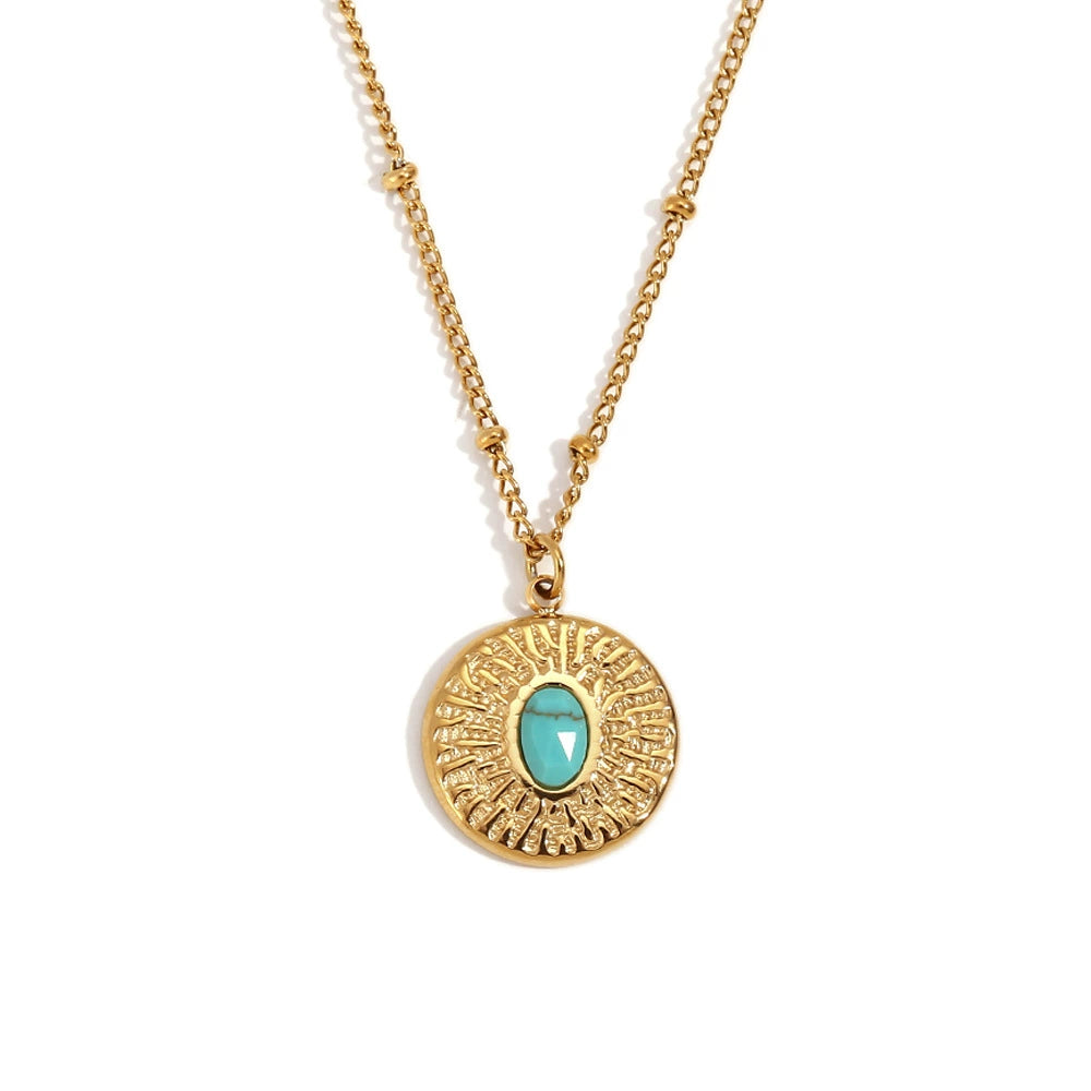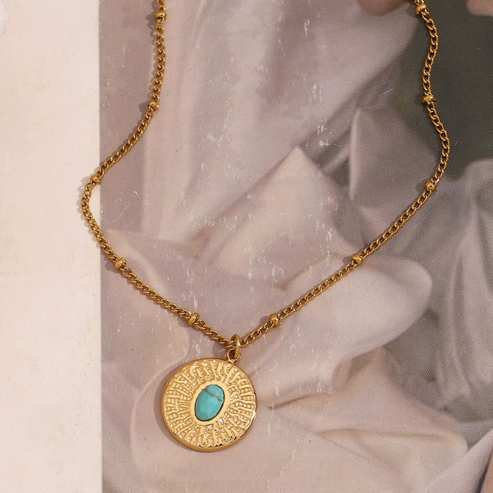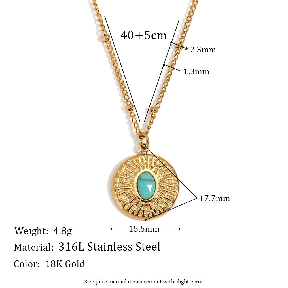 Wholesale Women's Stainless Steel 18K Gold Plated Bead Chain With Hammer Pattern And Turquoise Round Geometric Style Necklace