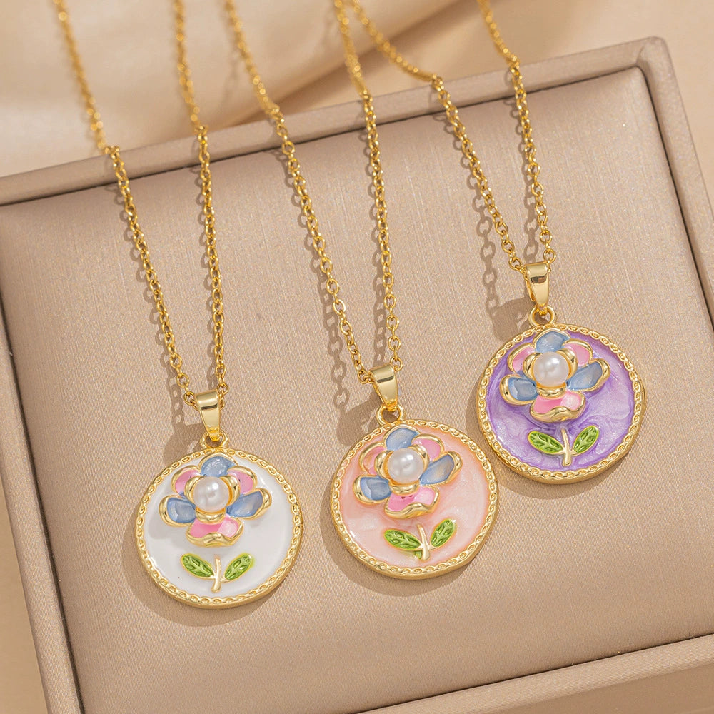 Wholesale Women's Titanium Steel Necklace With Copper Pendant In Monet's Garden Oil Painting Style Flower Shape Dripping Oil Design O Word Chain Light Luxury French Retro Simple