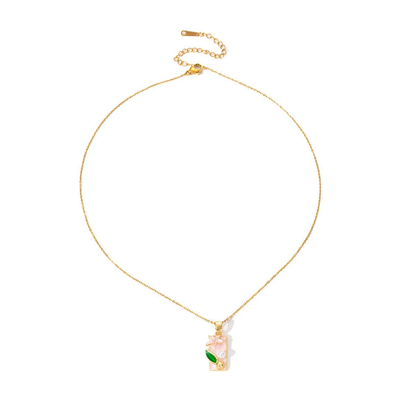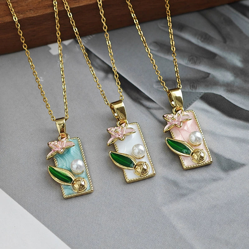 Women's Medieval Oil Painting Style Square Lily Titanium Steel Necklace With French Retro Drip Glaze Design Copper Pendant O Word Chain And Electroplating