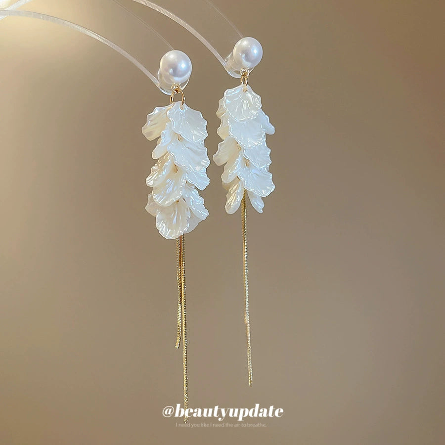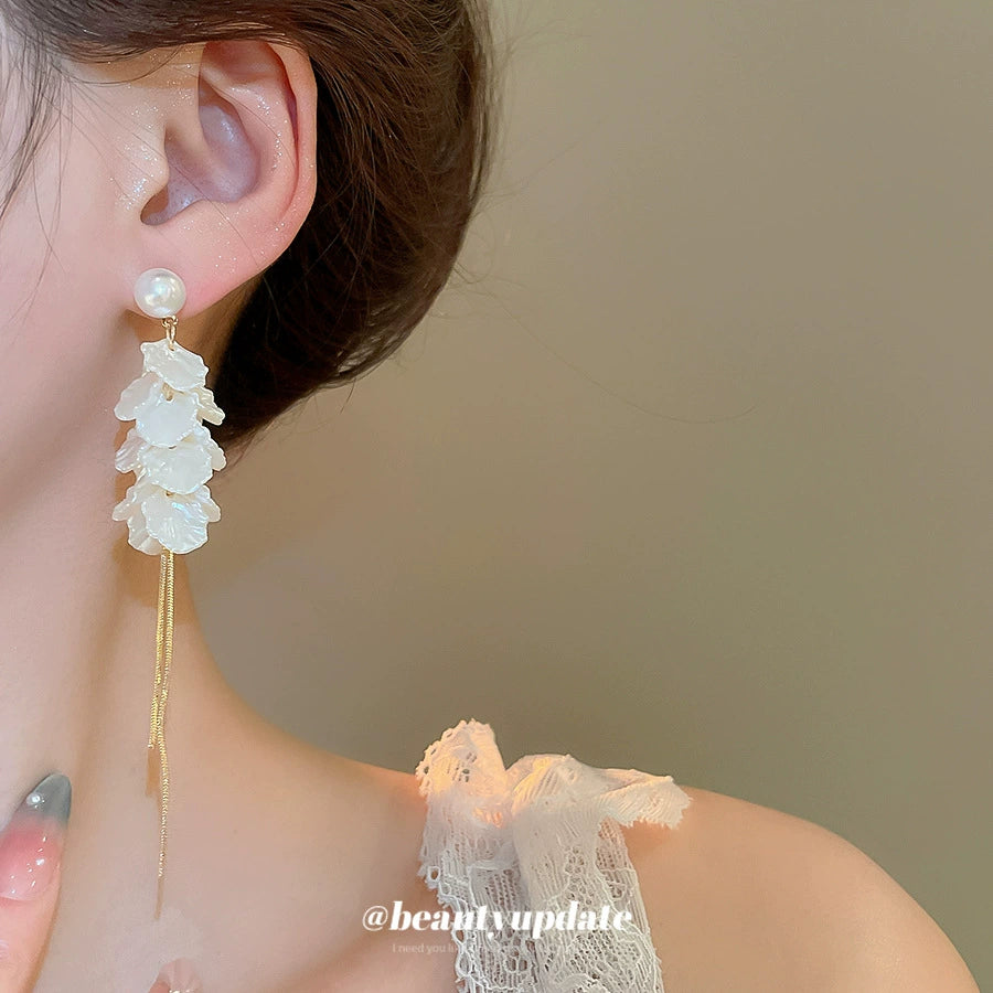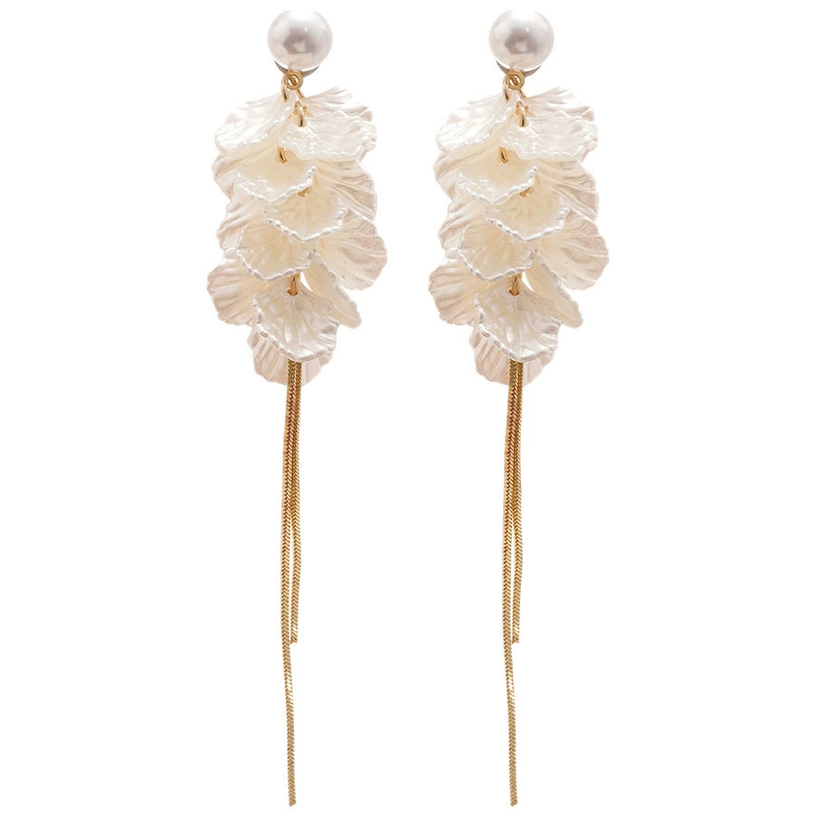Women's Silver Needle Imitation Pearl Flower Petals Tassel Ear Studs French Retro Elegant Electroplated Earrings