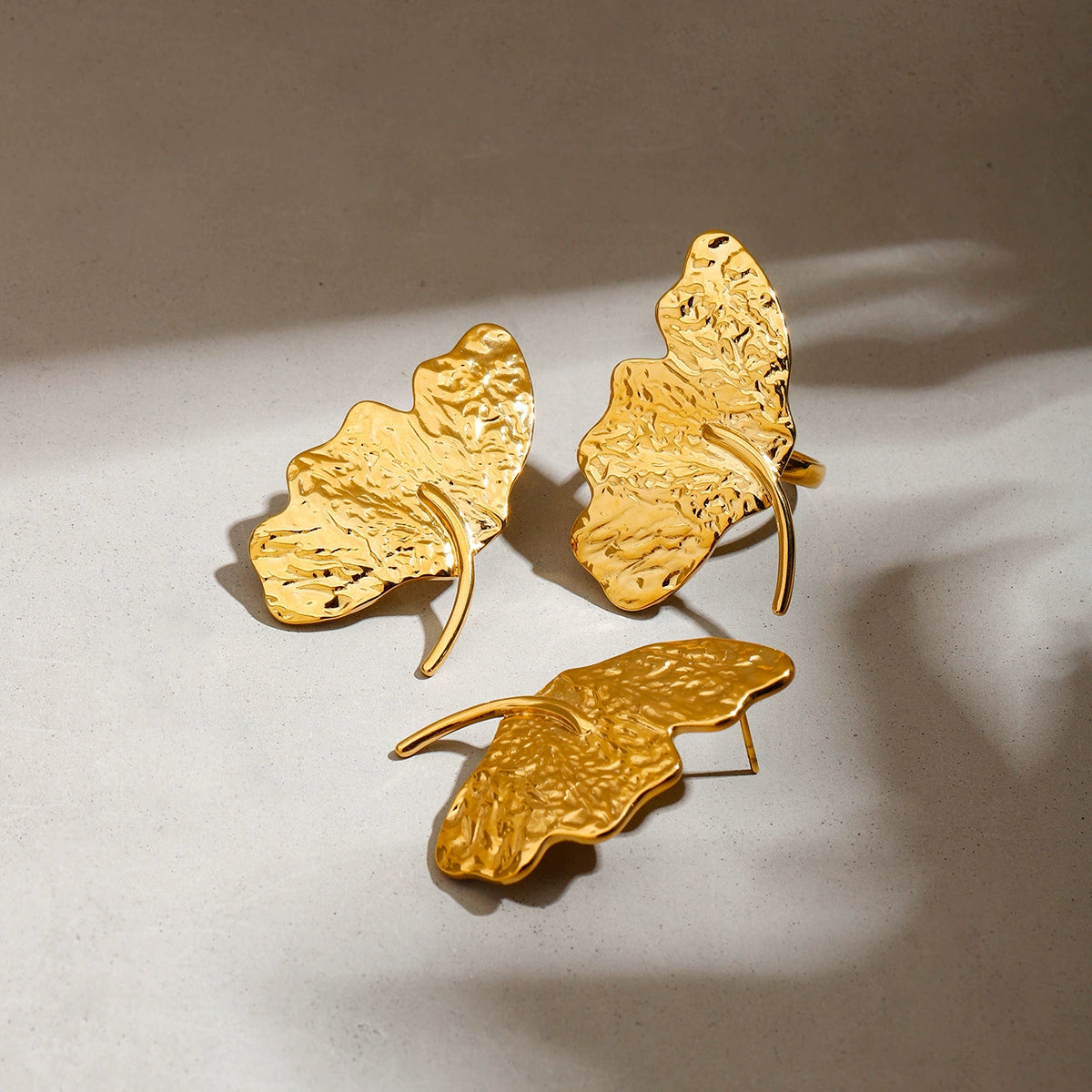 Women's Stainless Steel Geometric Pattern Electroplated Ginkgo Leaf Ring Earrings